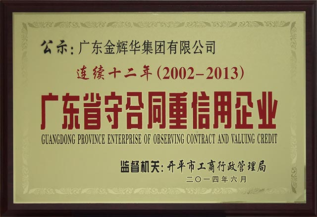 日前,我集團(tuán)公司順利通過廣東省工商行政管理局的考核公示,被授予“連續(xù)十二年(2002-2013)廣東省守合同重信用企業(yè)”榮譽(yù)稱號,以表彰我司在守信經(jīng)營、誠信經(jīng)營方面的優(yōu)秀表現(xiàn)。我集團(tuán)公司一貫高度注重誠信體系建設(shè),不斷規(guī)范合同管理,著力打造企...