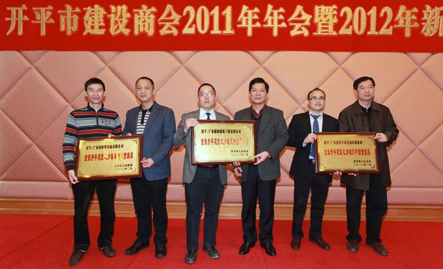2012年2月28日下午,市領導黃耀雄、文彥、張星杰、梁和平、陳偉成、鄺業禮、凌華威、黃繼燁出席建設商會2011年年會暨2012年新春宴會。此次宴會旨在表彰先進,弘揚典型,為推動重振開平建筑之鄉雄風工作再創輝煌。在過去一年里,許多建筑單位在企業發展、科技創新、繳納稅收等方面成績顯著。對此市人民政府決定對我集團公司等18家企業予以表彰。會上,市領導黃耀雄、文彥、張星杰、梁和平、陳偉成、鄺業禮、凌華威