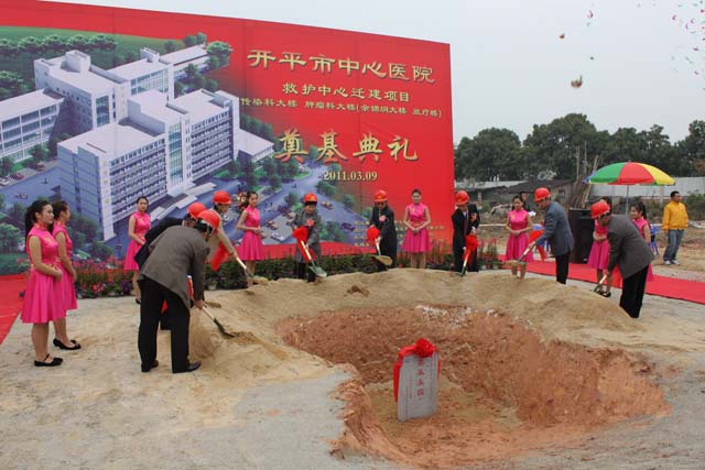 3月9日上午,我司承建的開平市中心醫院救護中心遷建項目奠基典禮在醫院西門工地隆重舉行。市人大副主任李寶貞同志、副市長梁民躍同志、政協副主席吉喆同志、中心醫院中層干部及我司項目班組成員等180多人了出典禮。救護中心遷建至中心醫院西側,占地34.95畝,興建傳染科大樓四層、腫瘤科大樓七層、放療樓單層,總建筑面積19630平方米,建設工期計劃至2012年1月竣工。工程竣工后,將進一步改善醫療衛生條件,提
