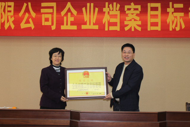 2010年12月24日上午“廣東金輝華集團有限公司企業檔案目標管理國家二級認定會”在集團技術中心會議室舉行,我司最終以88.2分的高分通過了企業檔案目標管理國家二級認定。圖為:我司接受企業檔案工作目標管理二級牌匾與會人員有江門市檔案局副局長周宏、調研員梁勁松、科長陳燁泉、科員趙國健,新會區檔案局副局長林社沃、股長黃東疇,鶴山市檔案局副局長譚寶娟、股長黃志恩,開平市檔案局局長余英瑞、副局長周松健、股
