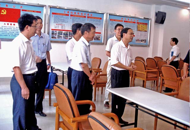 2010年9月8 日下午,江門市委政法委朱司亭副書記、江門市委黨校劉莊主任等處級干部調(diào)研班一行,在我市市委常委陳偉成、政協(xié)副主席、長沙區(qū)委書記林國寧同志帶領(lǐng)下蒞臨我司考察、調(diào)研及指導創(chuàng)先爭優(yōu)工作。 朱書記一行先參觀我司“創(chuàng)先爭優(yōu)宣傳欄” 及“黨工青婦活動之家”, 并詳細觀察“公開欄” 及活動照片,圖片說明,雜志架、圖書柜等;跟著到我司開發(fā)、施工、管理的“天富豪庭” 小區(qū)參觀考察,最后到我司技術(shù)中