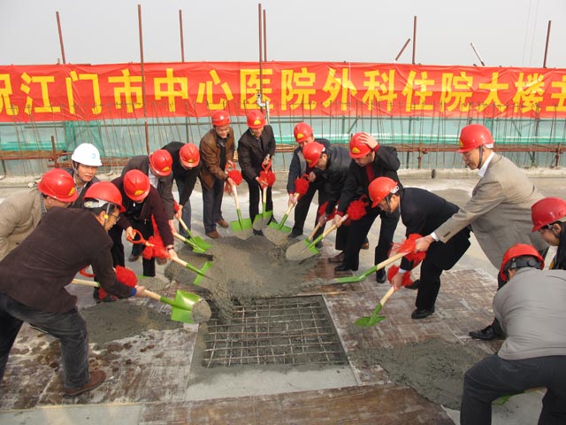 各位領導拿起鐵锨為江門中心醫院外科住院大樓工程封頂
