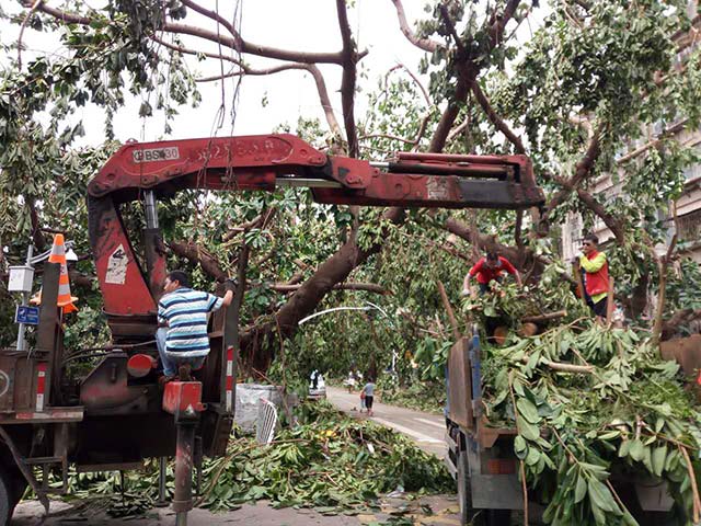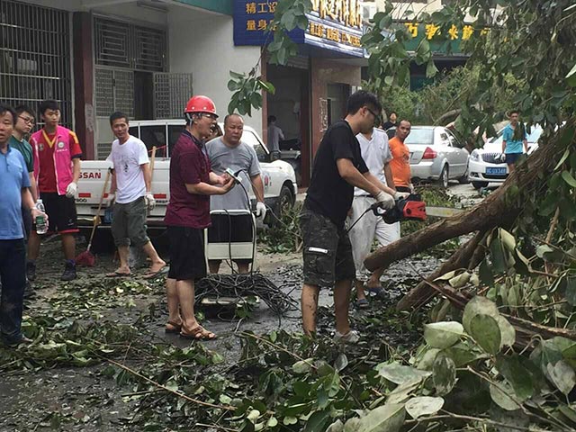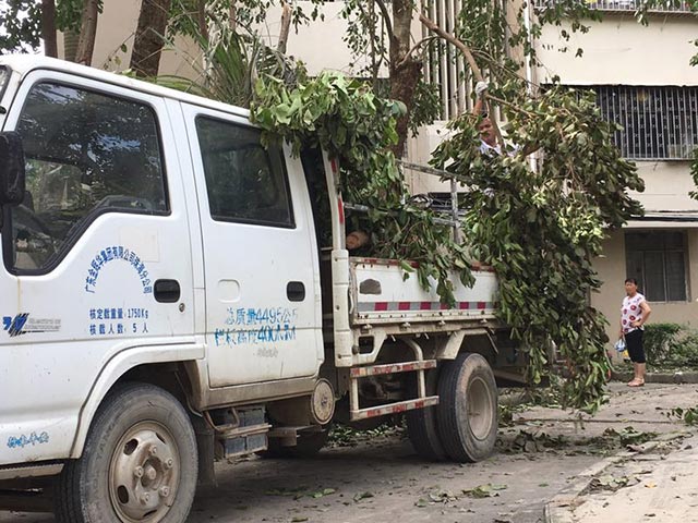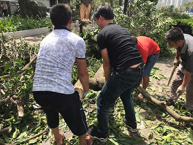 2017年8月23日中午12點50分,第13號臺風“天鴿”正面襲擊珠海市,大批樹木被攔腰折斷或連根拔起,造成大部分主干道堵塞,嚴重影響當地居民工作和生活?!疤鞛臒o情人有情”,我集團珠海公司在獲悉災情后,迅速行動,組織人員和車輛,全力以赴針對突出的受阻道路進行清理工作。在安平路、桃園路、海虹路、東風路等路段,隨處可見殘樹斷枝錯亂橫陳,珠海公司員工與當地居民一起清掃垃圾,搬移樹木。直到該路段清障工作完成,道路交通基本恢復。