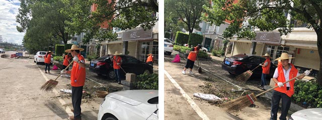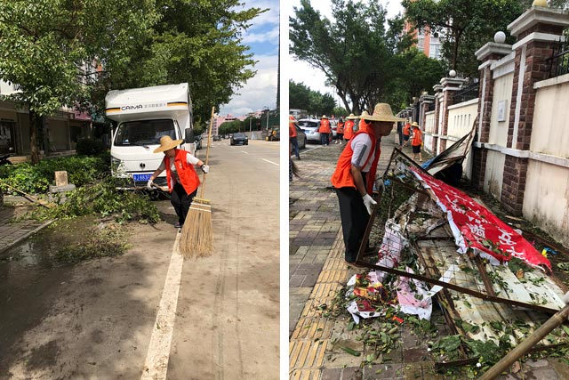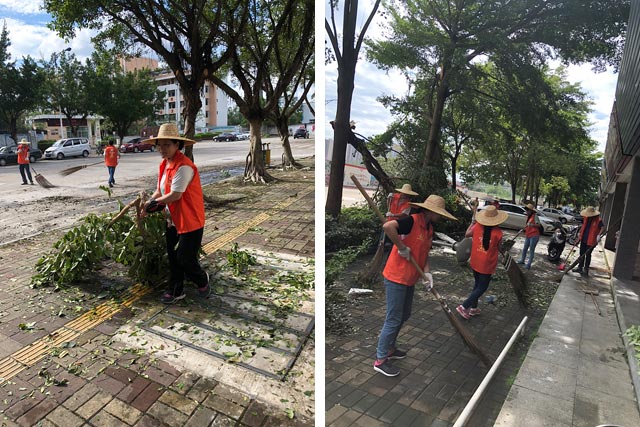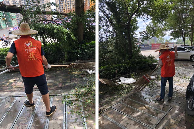 在清理路障現(xiàn) 場(chǎng),公司黨委書記張解矛帶領(lǐng)大家一起頂烈日冒酷暑,搬樹(shù)枝、掃殘葉、清廢物,將路面清理打掃干凈。