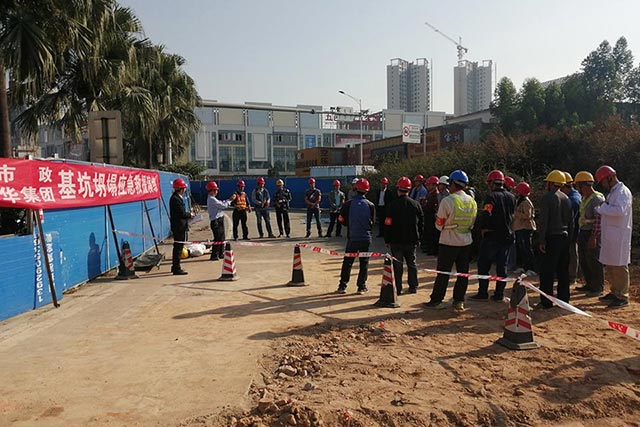 2019年11月21日(星期四)早上9:30,廣東金輝華集團公司承建的江門市供水管網擴容改造建設項目勘察設計施工總承包工程,在江門市蓬江區(qū)奇榜片區(qū)五邑機電城旁施工現場,進行”基坑坍塌應急救援演練”活動。演練的目的:1、評估安全事故的應急預案的響應啟動執(zhí)行力和響應及時性,分析預案內容的針對性和真實性;2、檢驗應急響應人員對應急預案的了解及實際操作熟悉能力,對應急物資的使用熟悉程度,評估應急知識培訓的效果,分析培訓需求,同時作為一種培訓手段,通過調整演練難度,進一步提高應急響應人員的綜合素質能力,提高全員安全意識。