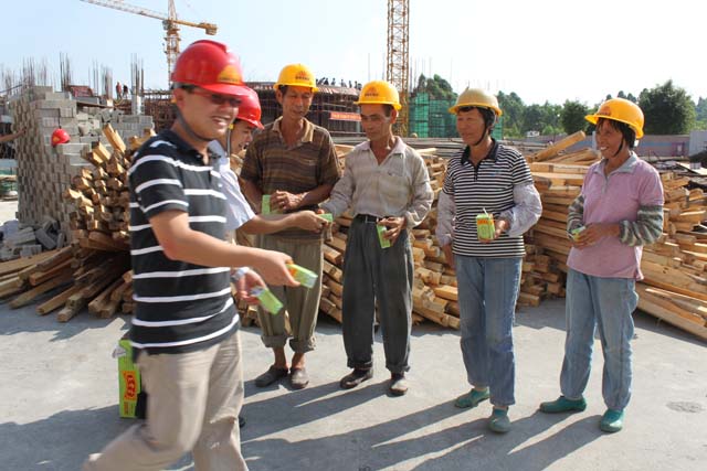 貫徹安監(jiān)總局辦公廳、衛(wèi)生部辦公廳、人力資源和社會保障部辦公廳、中華全國總工會辦公廳關(guān)于進一步做好夏季防暑降溫工作的通知精神,保障我公司集團員工在高溫天氣情況下安全順利的開展各項施工工作,公司黨委書記張解矛、工會副主席高迎春、行政中心副主任梁沛瑩、工程管理中心鄭國燦等同志于7月23日下午來到了金輝華綜合大樓施工現(xiàn)場,對一線施工人員在炎熱高溫環(huán)境下工作的情況進行了親切的慰。
