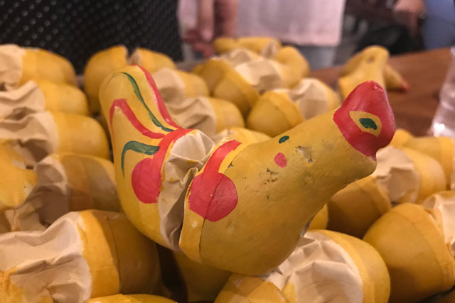 開平市水口鎮(zhèn)聯(lián)竹鄉(xiāng)制作鎮(zhèn)濠泥雞玩具已有二百多年歷史,以前每到農(nóng)歷春節(jié)前夕,來自鶴山、臺山、恩平、新會等地的商販們便駕車來采購泥雞作年貨銷售。泥雞外形古樸、價(jià)格便宜,深受人們的喜愛。大年初一是雞日,大量泥雞上市,一時(shí)泥雞啼聲四起,給人們帶來歡欣和喜氣。