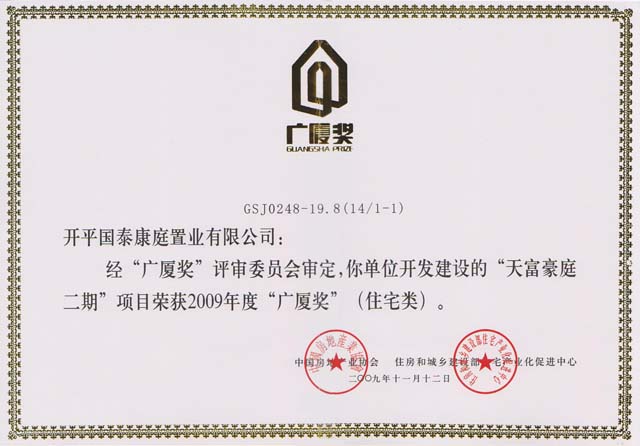 天富豪庭二期是廣東金輝華集團(tuán)有限公司與開平國泰康庭置業(yè)有限公司共同開發(fā)的住宅小區(qū),它以獨(dú)特的人文景觀及設(shè)計(jì)水平、環(huán)境質(zhì)量、功能配置、科技含量等諸多優(yōu)勢(shì),在全國眾多參評(píng)項(xiàng)目中脫穎而出,這是天富豪庭全體開發(fā)者和建設(shè)者的光榮。此次天富豪庭二期入圍2009年“廣廈獎(jiǎng)”,成為廣東開平首個(gè)獲此榮譽(yù)的房地產(chǎn)項(xiàng)目。